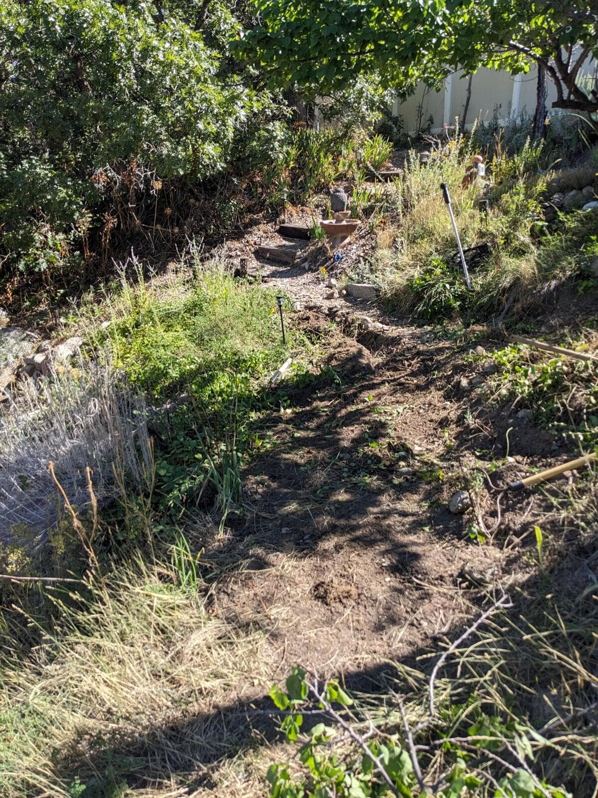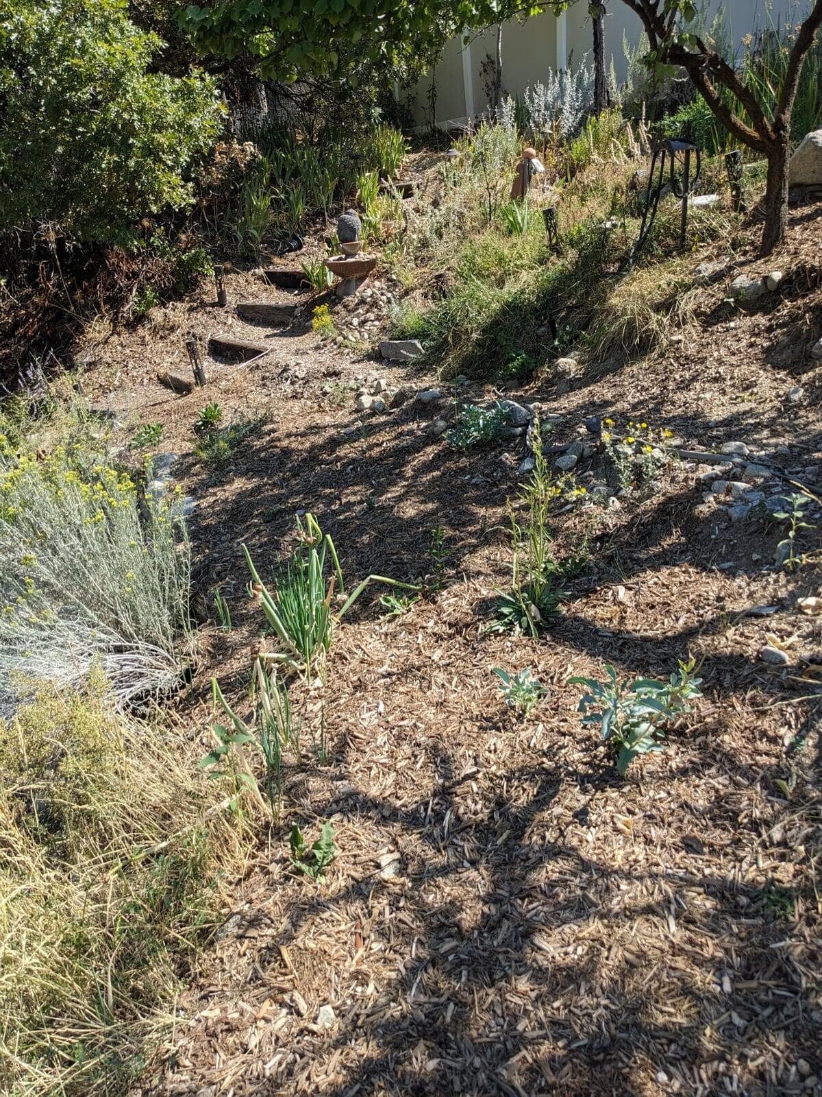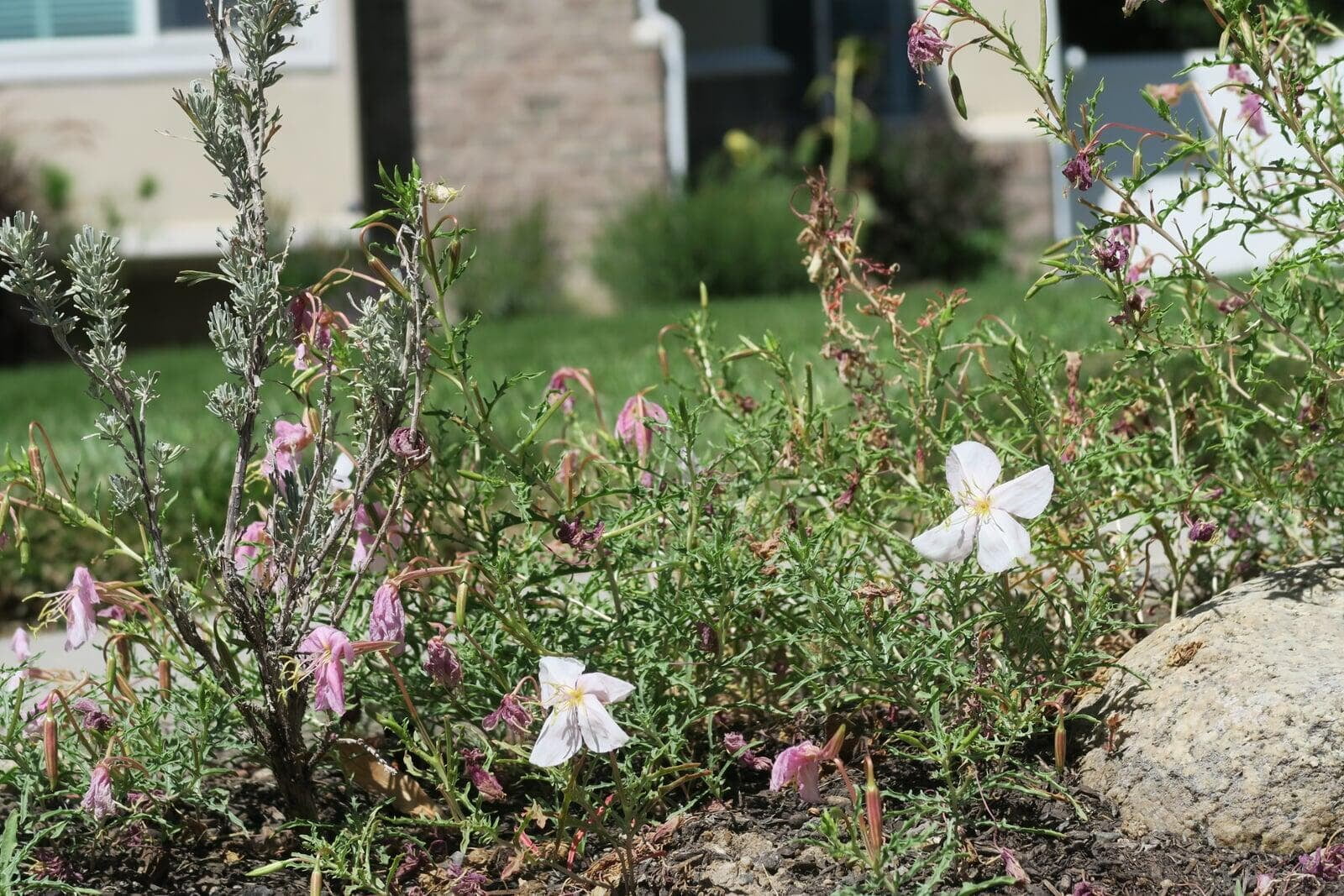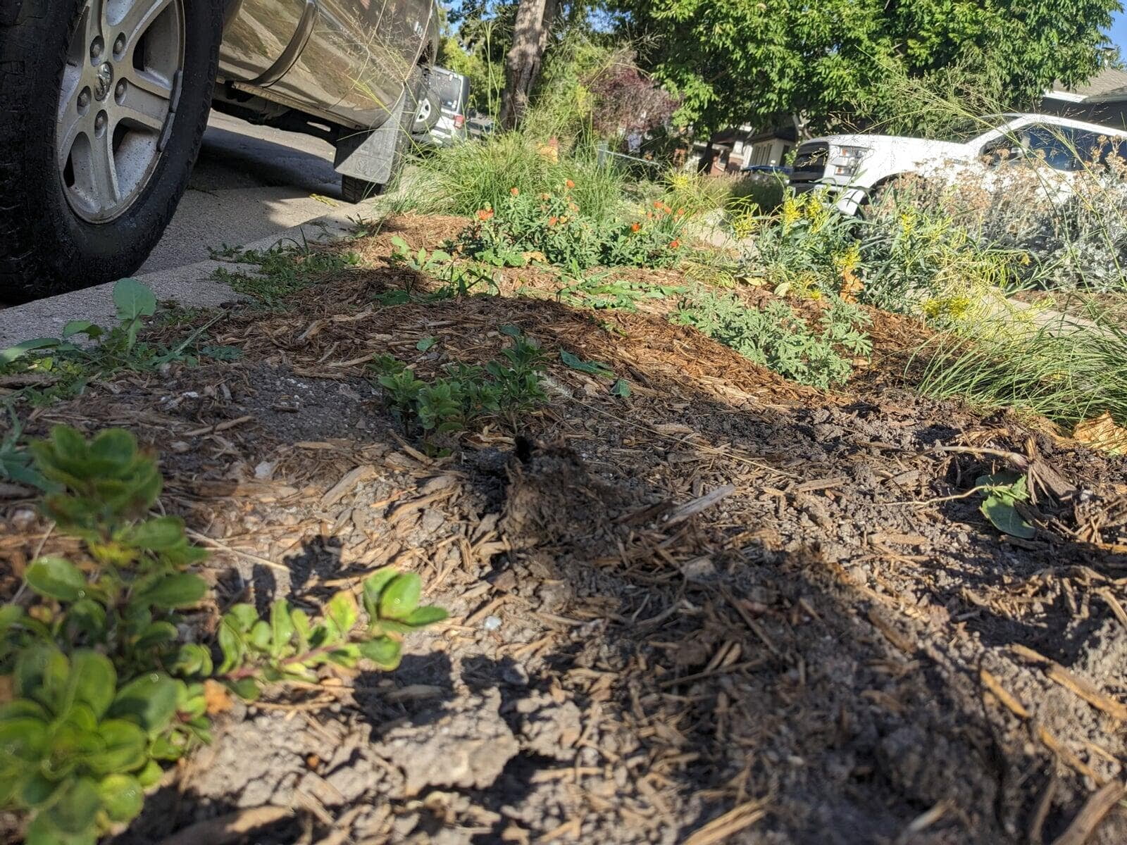 Seed of native species (Onothera palida, Circum undulatum) were collected from nearby Dimple Dell park and grown to be transplanted into this project. The park-strip also needed to have a cubic meter of soil and sod removed so that it would capture rainwater from the sidewalk. When digging, we found that significant excess water from the neighbor's lawn was draining into the park strip, so our design changed to include facultative wetland species in the wettest locations.