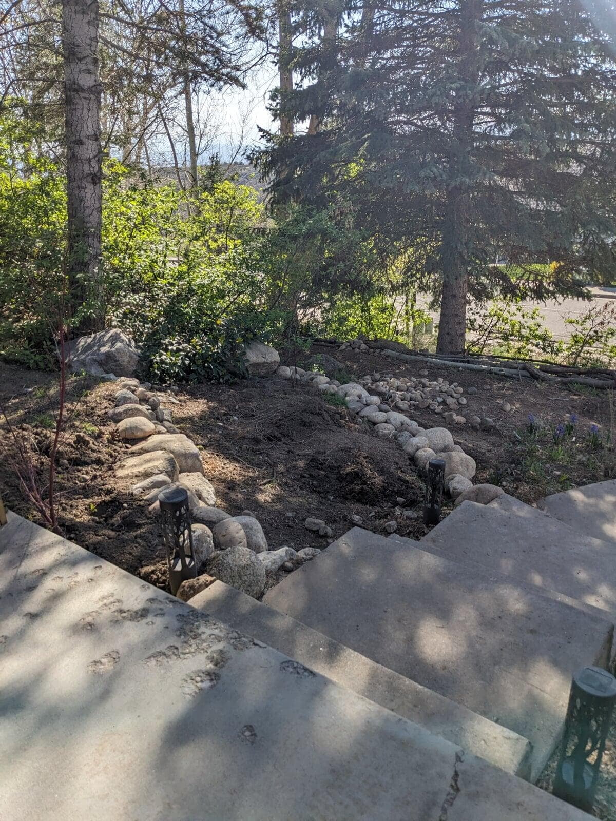 Situated in a glacial moraine, experiencing significant herbivory, being very sloped, and with well established native and invasive species, this was a challenging project. There were two objectives: One was to eliminate erosion from a drain that was responsible for discharging 45,496 L of rainfall (12,020 gallons) annually. The second was to establish bird and native pollinator friendly zones.