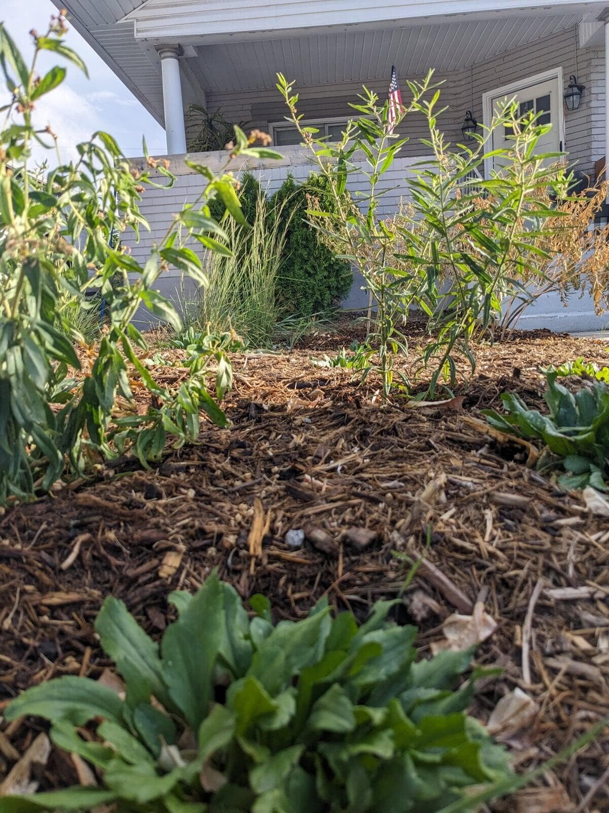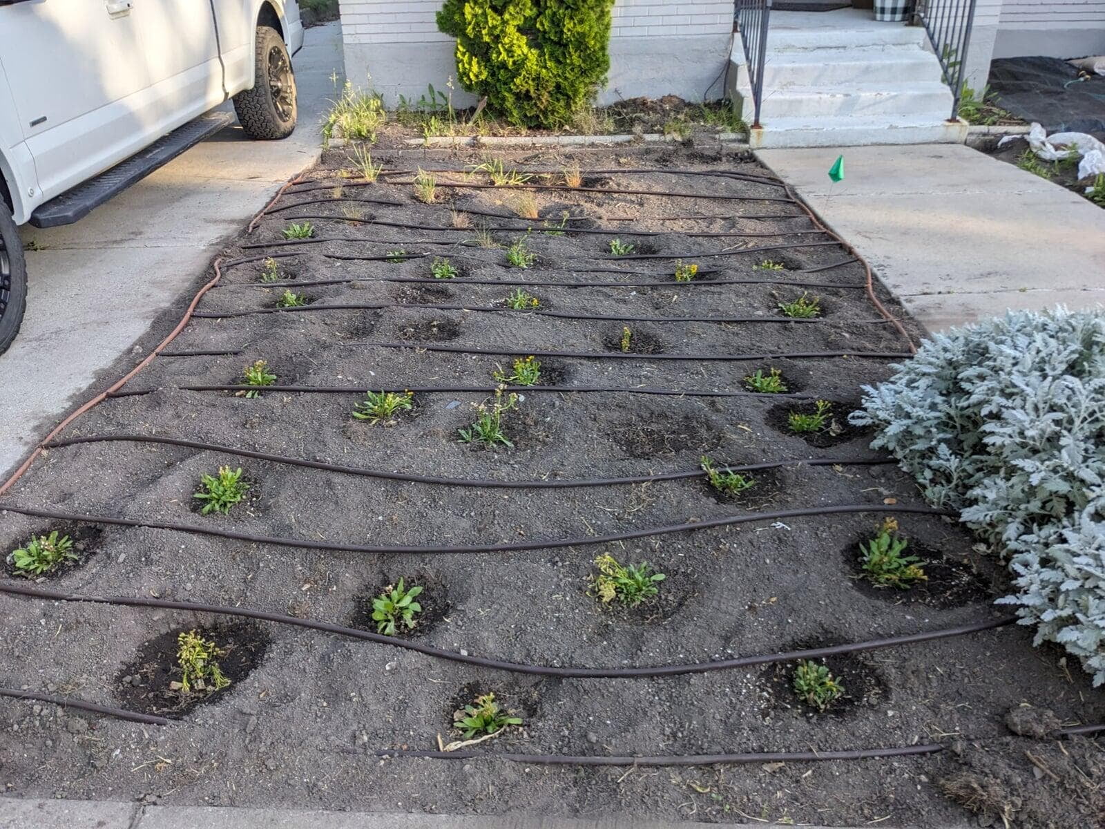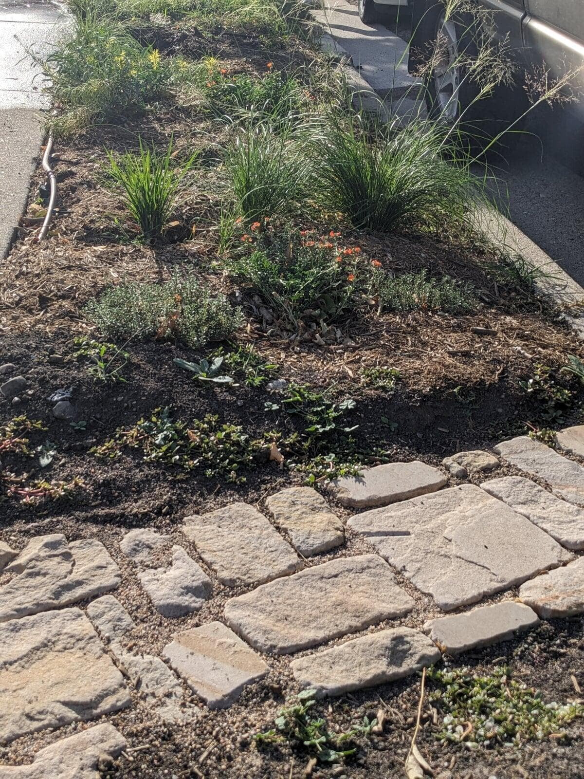 A significant number of the plants in this project survive without any supplemental irrigation. The space uses about 40 gallons per week, with 20 gallons used exclusively for 2 existing Eurasian ornamental trees (Betula platyphylla and Acer platanoides). Despite the tight water budget, no neighbor has complained about the lack of lawn. Rather, the design is complemented by those who stop to chat.
